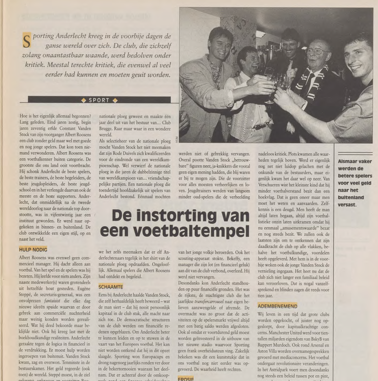 Az 1980-as évek elején a klub komoly válságba került. Ivic edző kinevezése azonban megnyugvást, megoldást és egyfajta megváltást hozott. Az alacsony termetű, ellentmondásos horvát tréner sikeres évek alapjait rakta le, melyekre később Van Himst és Haan építhettek. Megérdemelték az elismerést. Ám ezt követően lassú hanyatlás kezdődött. Ennek egyik fő oka, hogy az Albert Roosens által felépített klubstruktúra fokozatosan leépült. Sok tapasztalt szakember távozott vagy visszavonult, és ez a fiatalabb generációkra is negatívan hatott. A tehetségkutatás gyakorlatilag leállt. Bekeffy, a klubhoz életét és vagyonát kötő menedzser elhunyt, és nem akadt méltó utódja. Ennek ellenére az Anderlecht pénzügyileg stabil maradt – ez volt a kulcs a klub túléléséhez. Belgium leggazdagabb és leghatalmasabb klubjaként szinte egyedülálló módon irányította az átigazolási piac ritmusát: hol gyorsította, hol lassította azt, saját érdekei szerint. A játékoseladások és -vásárlások általában nyereséggel zárultak. Erre szükség is volt, hiszen a klub folyamatosan beruházott a stadion bővítésébe – mindezt állami támogatás nélkül. Üzleti szempontból ez páratlan teljesítmény volt a belga futball történetében. És az igazságot illik kimondani.